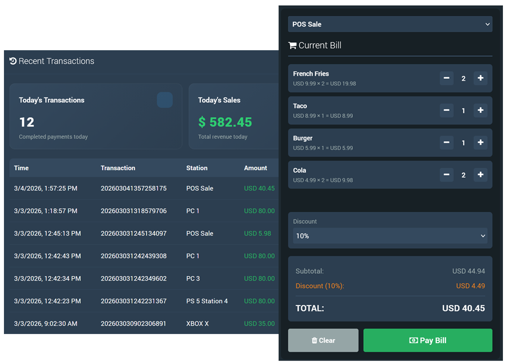 When the customer is done, Bills combines session charges and POS items into one checkout flow. Staff can open a bill, add usage and extras, close it, and issue a receipt with a full transaction record—including support for cash, card, wallet, and split payments.